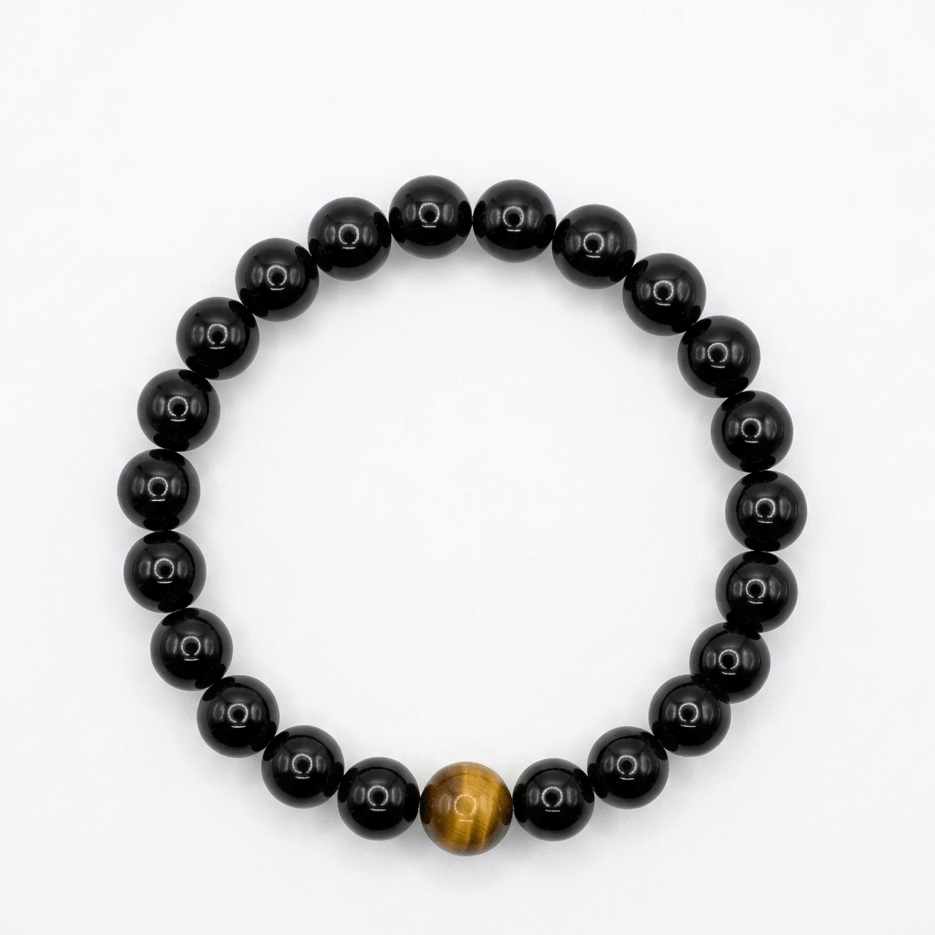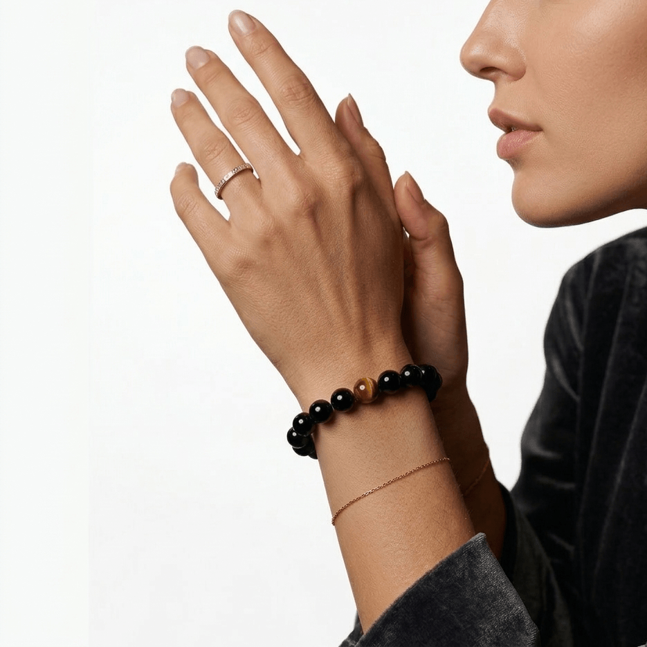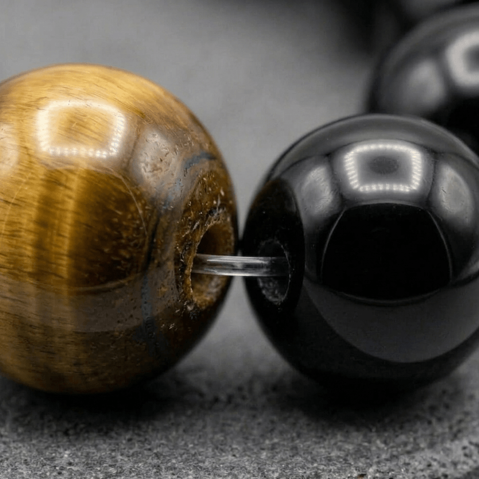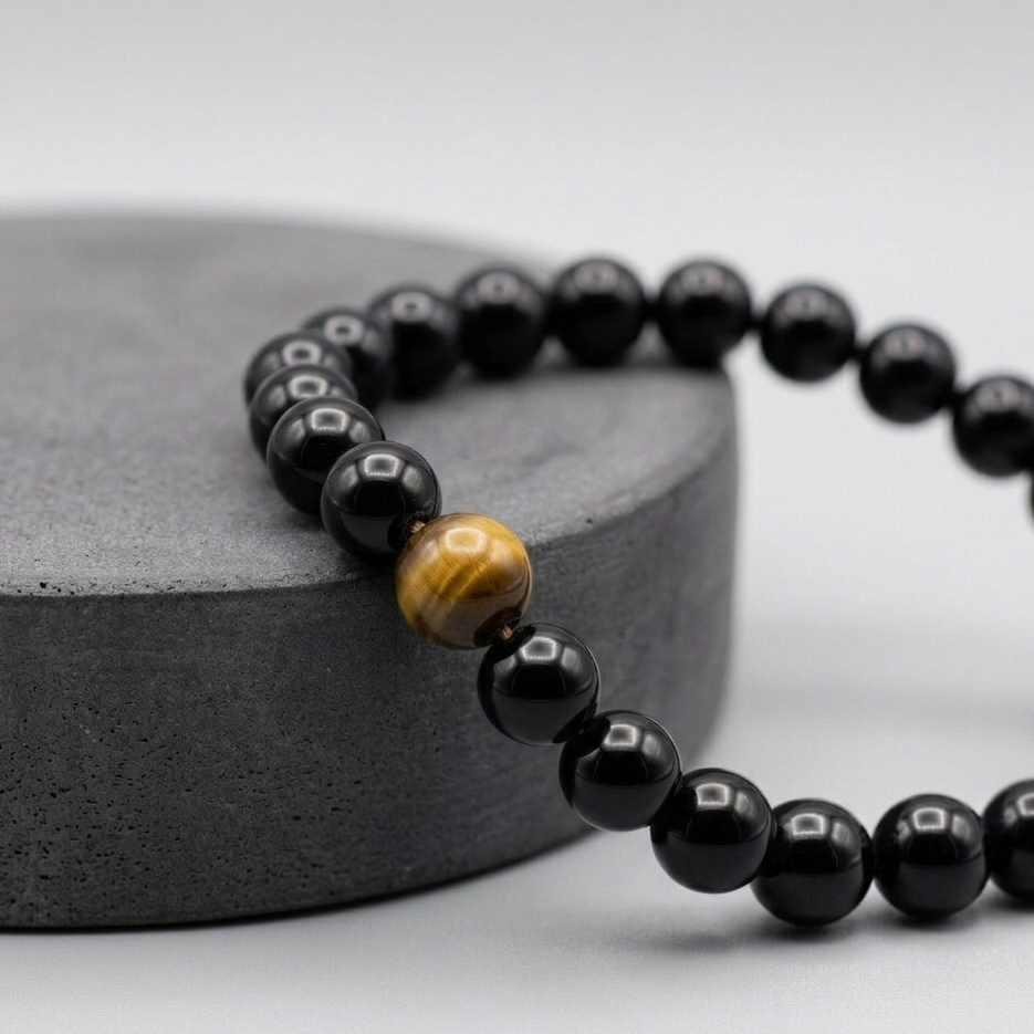 El Detalle de Distinción El diseño se rompe deliberadamente con una única esfera central de ojo de tigre de alta gama. Seleccionada por su chatoyancy (el efecto «ojo de gato»), esta piedra preciosa exhibe bandas doradas y pardas que parecen cobrar vida con el movimiento de la muñeca. Es el punto focal de la pieza: un recordatorio de perspicacia y fuerza interior que contrasta magistralmente con la oscuridad absoluta del ónix.